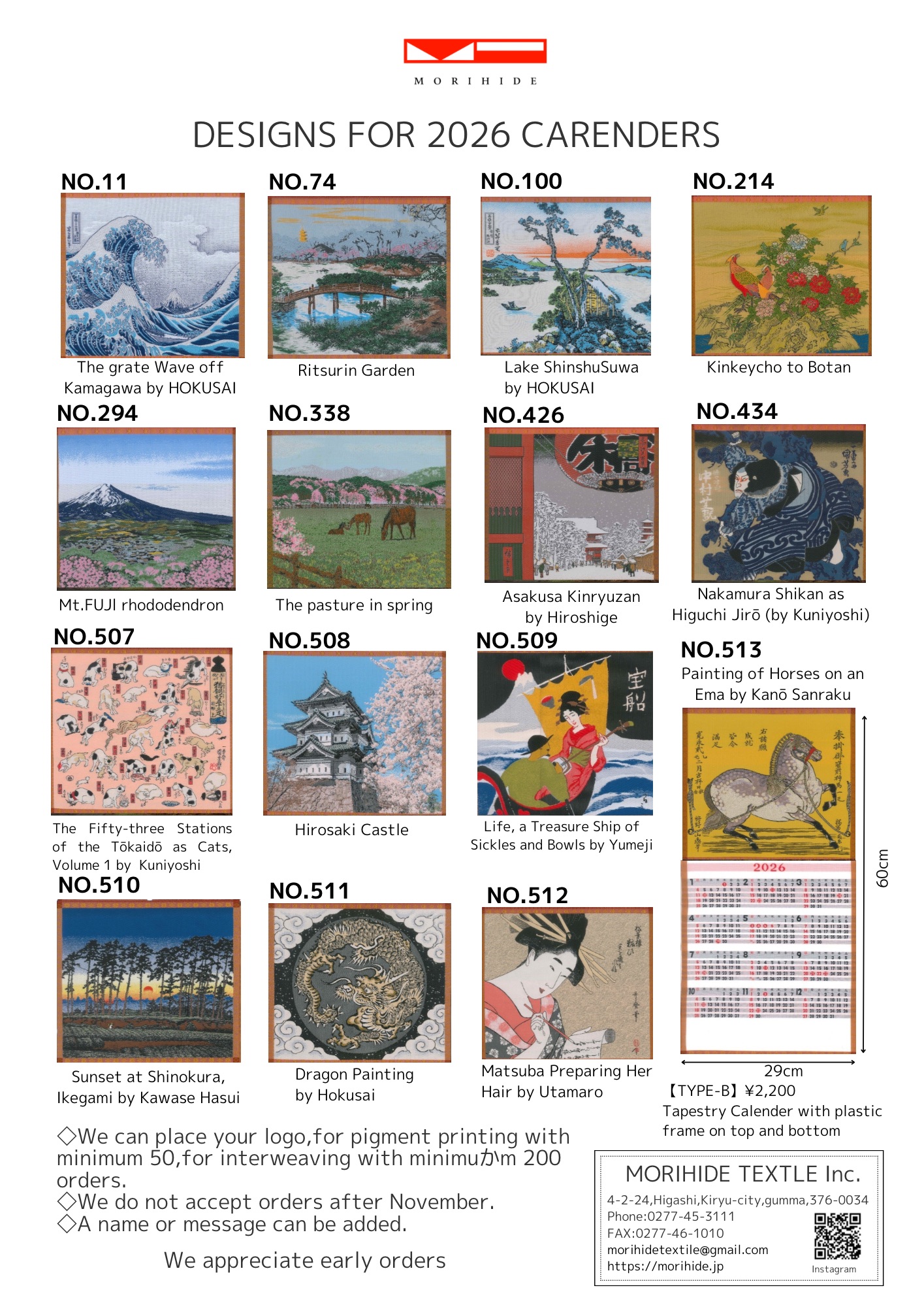 織物で表現された、壁掛けカレンダー 一年間飾った後は数字部分を外して絵画としても楽しめます 伝統的な日本の織物技術で織られる 浮世絵 美人画 伝統画 風景画をお選びください